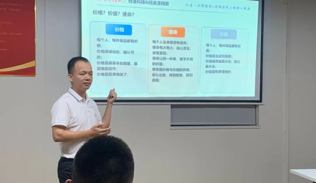 2025年10月14日晚间,广东铨圣科技&钰名圣精密科技中高管训练营全体学员齐聚,参加由公司组织开展的《49天使命血肉化训练营》第一期专题分享会。